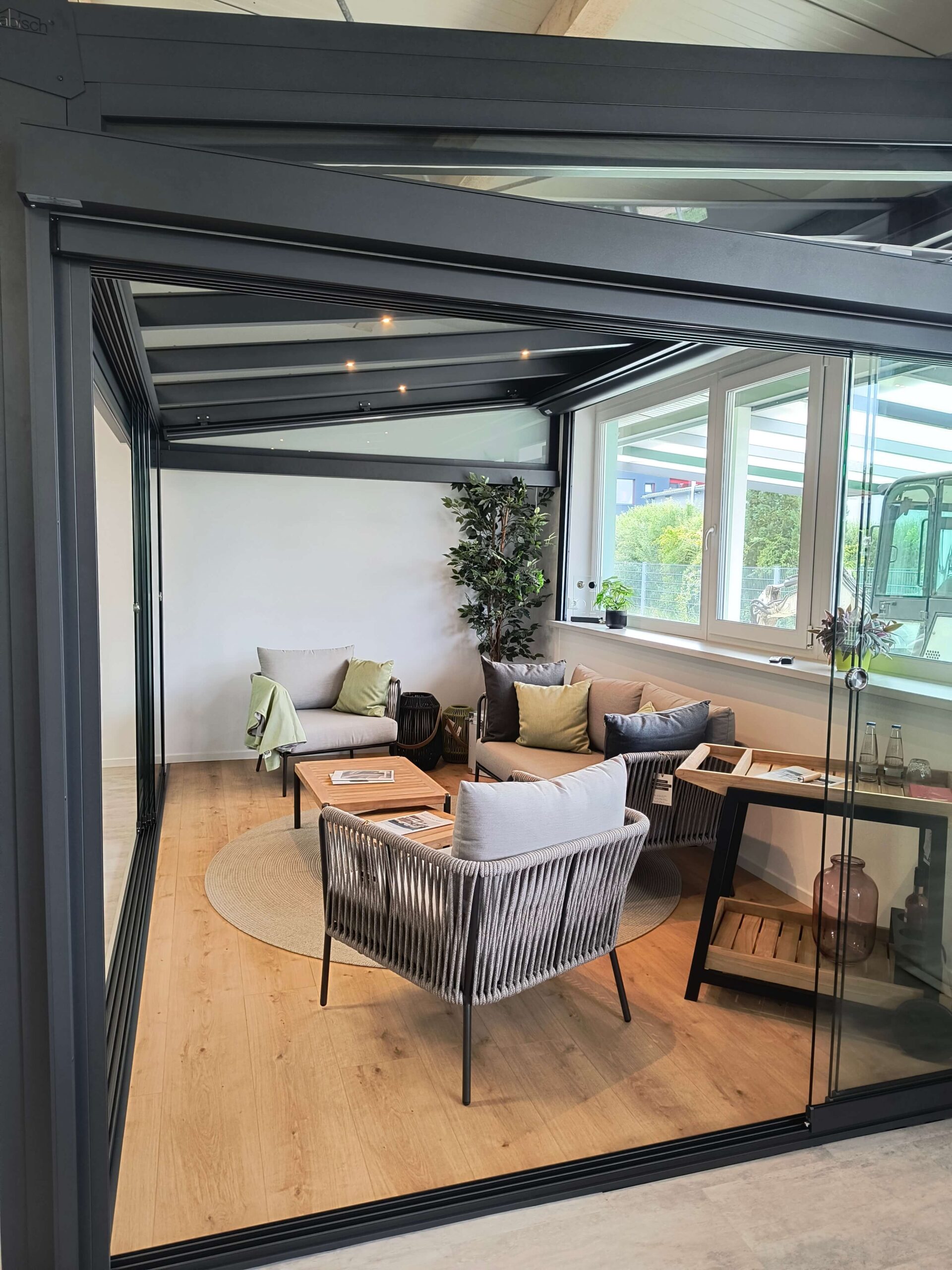 In unserem Showroom erleben Sie eine moderne Terrassenüberdachung mit integrierten LED-Spots und eleganten Schiebeelementen.