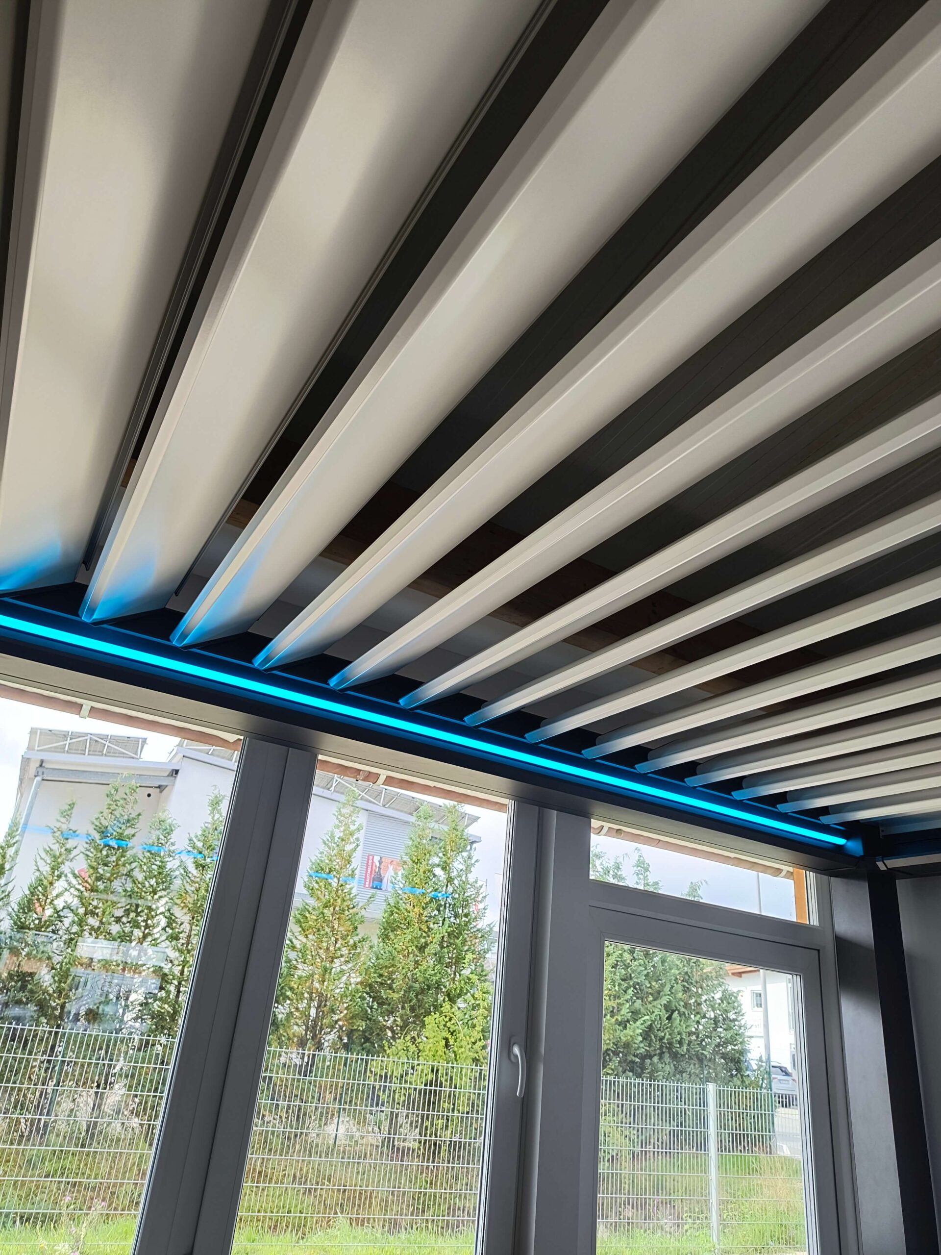 Entdecken Sie in unserem Showroom ein hochwertiges Lamellendach mit beeindruckender Farbwechsel-LED-Beleuchtung.